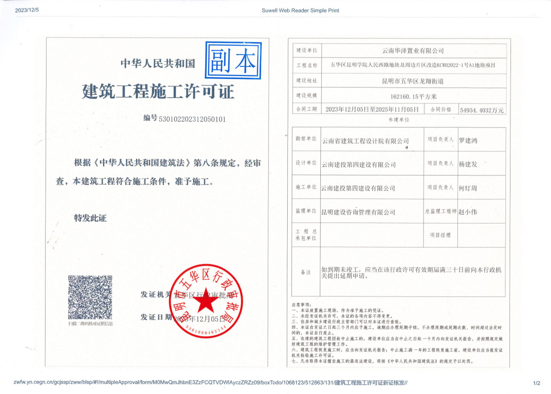 12月5日,華澤公司建投·春城華府項(xiàng)目A1商業(yè)地塊順利取得項(xiàng)目工程施工許可證。該項(xiàng)目于2023年1月30日摘地后,于3月8日完成投資備案,3月9日取得建設(shè)用地規(guī)劃許可證,7月20日取得A1商業(yè)地塊建設(shè)工程規(guī)劃許可證。